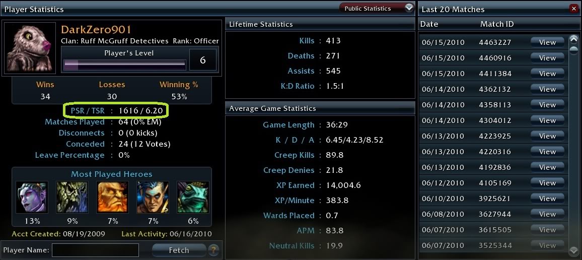 TSR является уравновешенной системой, на которую не влияет PSR аккаунта. Факторы влияющие на TSR: Убийств, Смертей, Помощи, Крипов убито (скорректирована для EM), Добитых крипов (скорректирована для EM), Опыта в минуту (скорректирована для EM), Золота в минуту (скорректирована для EM), Вардов поставлено, и Процент побед. Каждый из этих факторов рассчитывается относительно среднего игрока. Статистика среднего игрока посчитана благодаря собранным сведениям с более чем миллиона матчей. Статистика выдаваемая игроку сравнивается со средней статистикой. Убийство крипов, Добивание крипов, опыт в минуту и золото в минуту скорректирована в отрицательную сторону с учётом EM игр. Формула также корректируется, основываясь на средней продолжительности игр. Раз в два месяца, когда накапливается много новых данных, TSR обновляется.